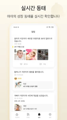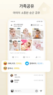베베메모에 업로드된 모든 순간들은 아기의 연령에 따라 놀랍도록 정돈됩니다. 처음 걸음마를 떼던 날부터 생애 첫 생일까지, 아이의 발달 단계를 한눈에 볼 수 있는 마일스톤 기능과 함께 성장 여정을 시각적으로 추적해보세요. 사랑하는 가족과 친구들을 초대하여 이 소중한 순간들을 함께 나눌 수도 있습니다. 더 이상 일일이 사진을 보내는 번거로움 없이, 베베메모 안에서 온 가족이 아기의 빛나는 성장을 실시간으로 공유하며 행복을 더할 수 있습니다.