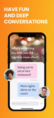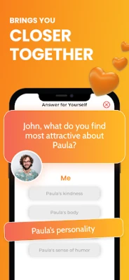 본 **커플 게임**은 몰입감 넘치는 방식으로 서로를 알아가게 합니다. 먼저 당신이 개인적인 질문에 답하고, 이어서 파트너가 동일한 질문에 답합니다. 그 다음, 두 분의 답변을 비교하며 얼마나 서로를 이해하고 있었는지 확인하는 시간을 갖게 됩니다! 최고 점수를 달성하는 재미도 있지만, 진정한 보상은 바로 두 분의 관계가 깊어지는 것에 있습니다. 수백 가지에 달하는 흥미로운 질문들은 다양한 주제를 다루며, '5가지 사랑의 언어'에서 착안된 질문들은 의미 있는 소통을 촉진합니다. 장거리 연애 중인 커플에게는 떨어져 있어도 마음을 연결하는 따뜻한 방법이 되어주며, 모든 대화와 답변은 자동으로 저장되어 언제든 다시 확인하며 소중한 추억으로 간직할 수 있습니다.