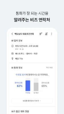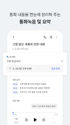 "에이닷 전화"는 당신의 생산성을 한 차원 높여줍니다. 모든 통화 내용을 자동으로 기록하고, AI가 이를 정확한 텍스트로 변환한 후 핵심 내용을 간결하게 요약해줍니다. 심지어 통화 후 필요한 업무까지 제안하여 중요한 약속이나 할 일을 잊을 염려가 없습니다. 또한, 방대한 비즈니스 정보를 실시간으로 탐색할 수 있는 비즈연락처(구 T114)는 AI 분석을 통해 해당 업체를 주로 이용하는 고객층이나 통화하기 가장 좋은 시간대까지 알려주어 더욱 현명한 소통을 가능하게 합니다. AI 추천 기능은 통화 상대방의 정보나 최근 대화 이력 등 유용한 컨텍스트를 제공하여, 매번 더 깊이 있는 대화를 나눌 수 있도록 지원합니다.