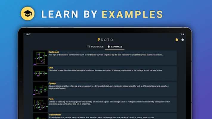 PROTO의 직관적인 인터페이스는 전압 값의 애니메이션과 전류 흐름의 시각화를 통해 회로의 동작 원리를 생생하게 보여줍니다. 단일 재생/일시정지 버튼으로 시뮬레이션을 완벽하게 제어하고, 회로 부품을 손쉽게 복사하며 설계를 확장해 나갈 수 있습니다. 앱 내의 예제 회로와 전문 비디오 튜토리얼을 통해 전자 지식을 심화하고, 다크, 라이트, 오션, 솔라라이즈드 등 다양한 테마로 자신에게 맞는 최적의 작업 환경을 구축해 보세요.