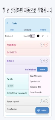 학생이든 직장인이든, 혹은 가정을 이끄는 분이든 관계없이, **ScheduleNow**는 당신의 하루를 효과적으로 계획하고 목표를 달성하도록 지원합니다. 회의 일정부터 개인 습관, 운동 루틴, 중요한 알림까지, 모든 것을 하나의 간결하고 사용하기 쉬운 플래너에서 통합 관리하세요. 요일별 일일 루틴을 손쉽게 설정하고, 반복되거나 한 번뿐인 작업들을 간단히 추가할 수 있습니다. 카테고리별로 작업을 정리하여 명확한 시야를 확보하고, 불필요한 방해 없이 핵심 기능들을 활용하며 생산성을 높일 수 있습니다.