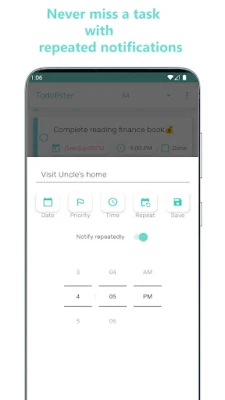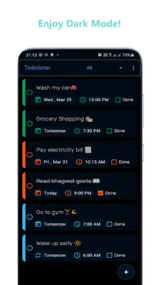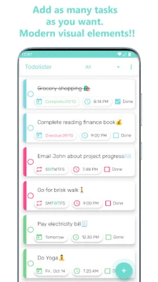 Todolister: Tasks & Reminders는 할 일 관리와 생산성 향상을 위한 앱입니다. 일일 목록, 무제한 작업 저장, 기한/알림 설정을 지원하며, 반복 알림과 다양한 필터로 중요한 작업을 놓치지 않게 돕습니다. 색상별 우선순위, 다크 모드 및 현대적 애니메이션 디자인으로 작업을 즐겁게 완료하세요.
